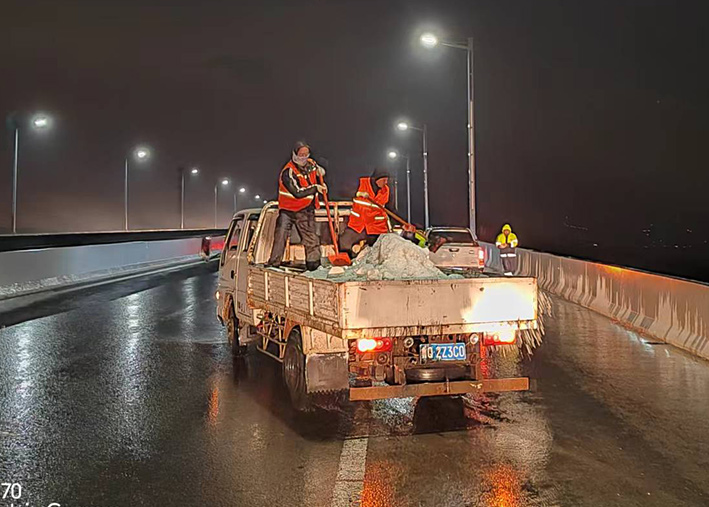 該公司迅速啟動(dòng)突發(fā)天氣應急保障預案,近30余名道路應急排險突擊隊員,在公司統一按排下 ,裝車(chē)備運融雪鹽斤近15噸,現場(chǎng)工作中隊員們士氣高漲,無(wú)所畏懼。夜間8時(shí)左右,10余名黨員先鋒,兵分三路再次安全有序奔赴燒香河、海濱大道、228等路段橋梁,無(wú)懼大風(fēng)夾著(zhù)冰雨顆粒吹打臉頰,兩人一對、三人一組、揮動(dòng)手中鐵銑,汗水與冰雨濕透橙色衣衫,經(jīng)過(guò)近4個(gè)多小時(shí)努力奮戰,人工撒放融雪鹽斤近20余噸,高質(zhì)高效保障近30座橋梁安全通暢。