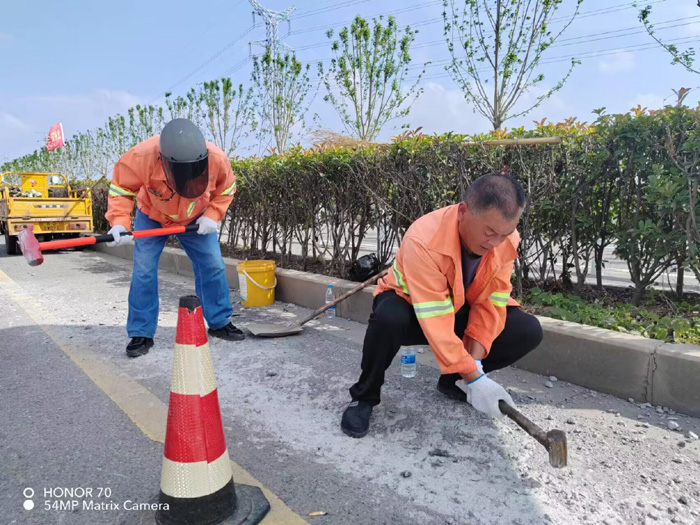 228省道西側,班長(cháng)姚功巡查時(shí)發(fā)現,有近50多米長(cháng)混凝土攪伴物拋灑主干道路面,如不及時(shí)處理,嚴重影響路面行車(chē)安全。班長(cháng)姚功及時(shí)召集隊員,馬不停蹄趕赴道路現場(chǎng)。上午10時(shí)左右,室外氣溫已經(jīng)直逼35℃,大家顧不上天氣的炎熱,揮動(dòng)手中鐵錘,不停地震動(dòng)路面“凍結”已久的水泥,黨員胡可貴與同事徐育軍、伏彩林主動(dòng)參戰,交替使用手中的撬棍,盡管汗水浸透橙色衣衫,雙手磨出了血泡,大家也沒(méi)有叫苦叫累,經(jīng)過(guò)近三個(gè)多小的努力奮戰,終于恢復原有黑色柏油路面。
